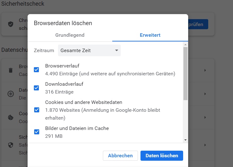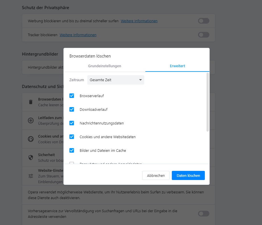 Unter der Überschrift "Datenschutz" findest du die Schaltfläche "Browserdaten löschen".