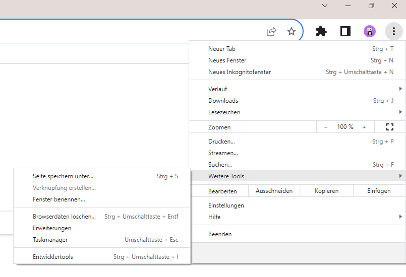 Klicke auf Weitere Tools > Browserdaten löschen. Als Tastenkombination kannst du Strg + Umschalt + Entf auf Windows und ⇧ [shift] + ⌘ [cmd] + [del] auf Mac verwenden.