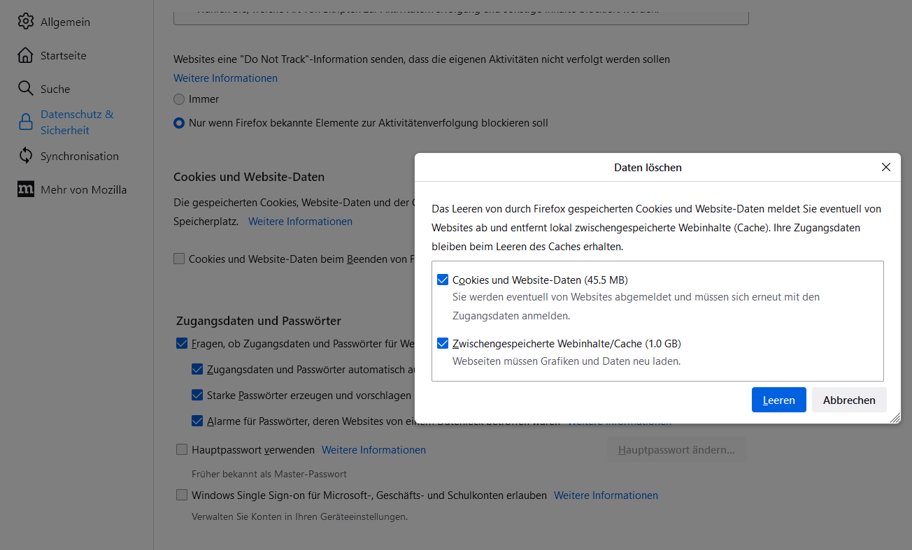 Setze ein Häkchen bei Cookies und Websitedaten sowie Zwischengespeicherte Webinhalte und klicke auf Leeren.