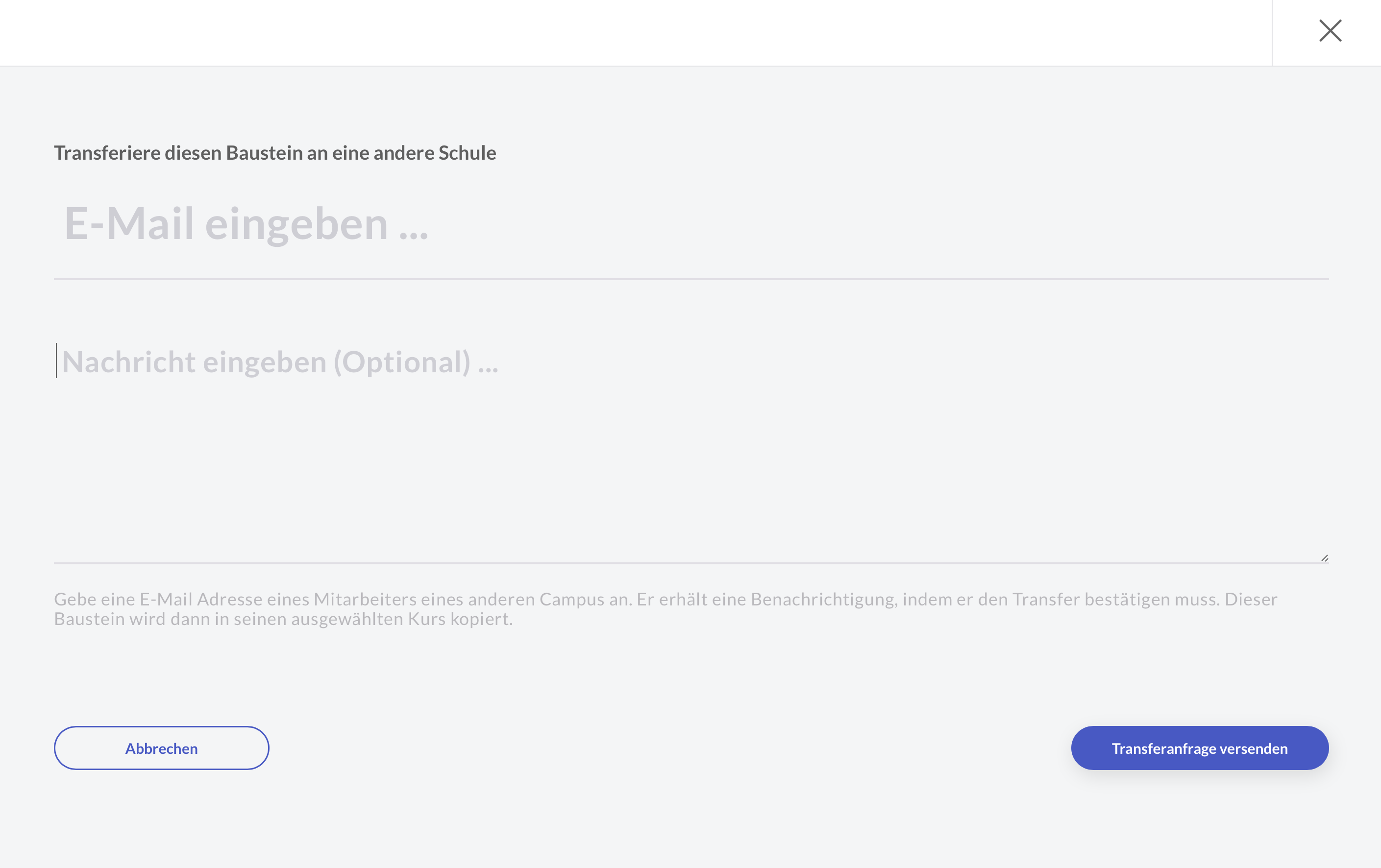 Die Übertragung eines Moduls ist für bestimmte Lerninhalte möglich. Dies ermöglicht es Ihnen, Ihre erstellten Inhalte mit anderen virtuellen Campus zu teilen.