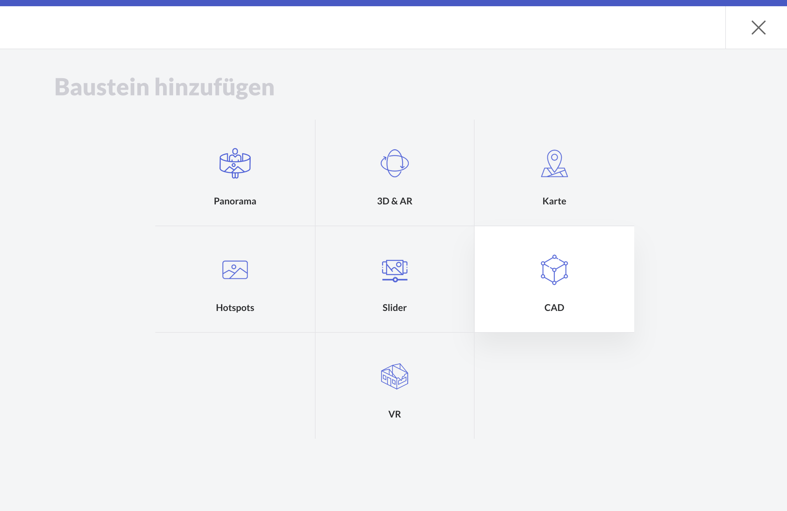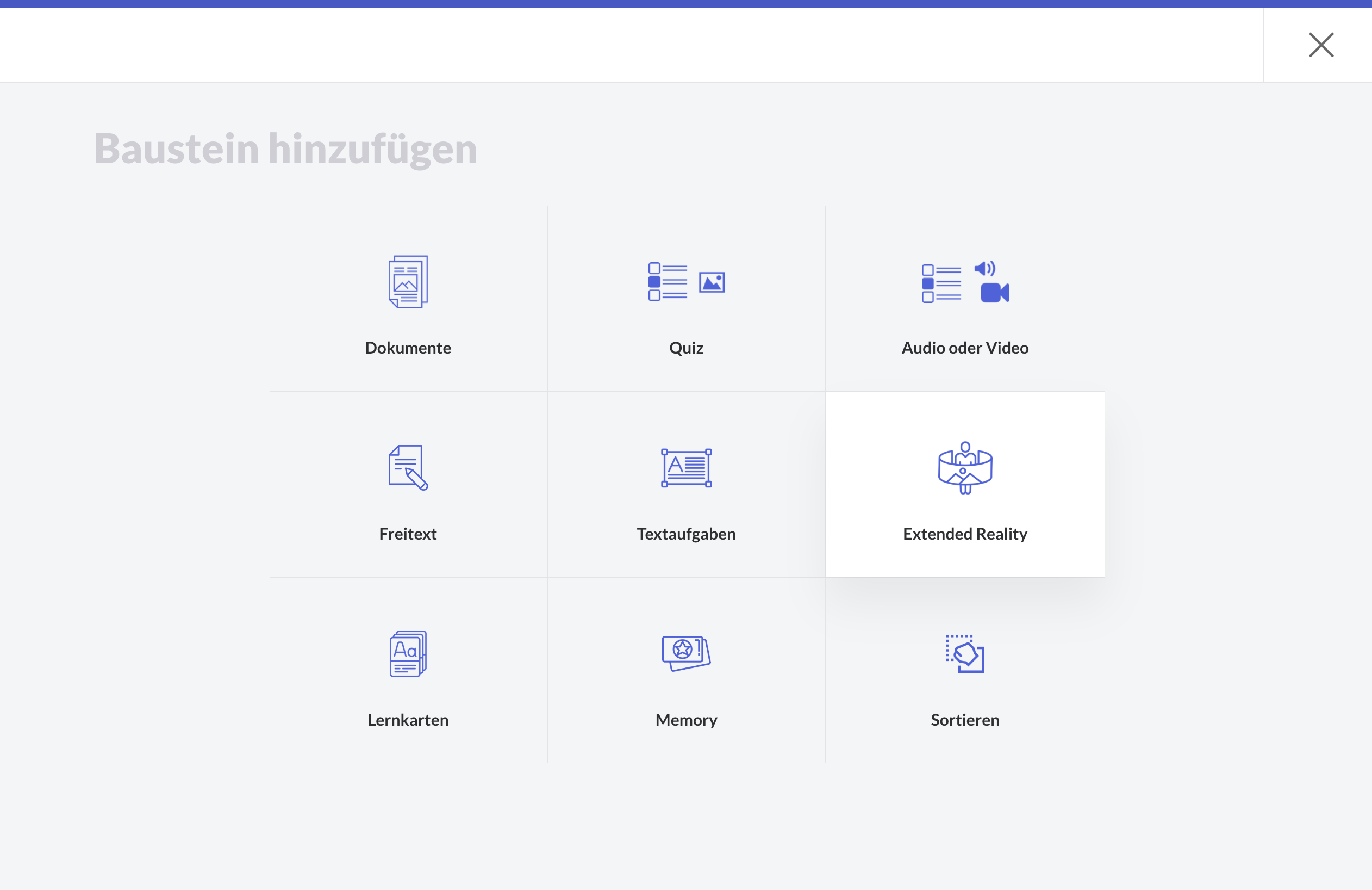 Gehen Sie zu Ihrem Kurs ➝ Ihre Sektion ➝ einen neuen Baustein hinzufügen ➝ (Alle Bausteine) ➝ Extended Reality ➝ CAD