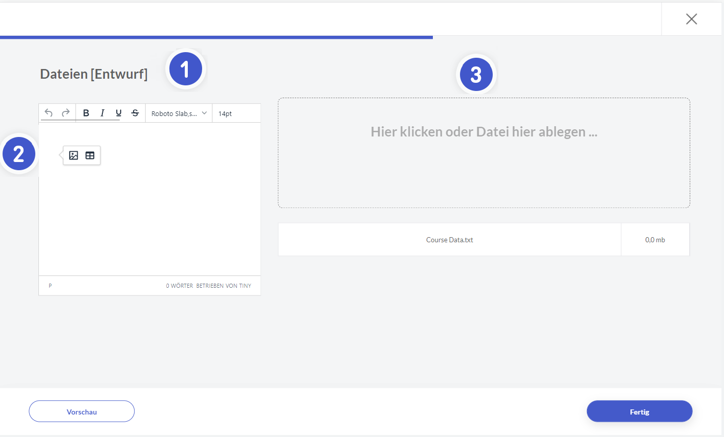 Ein Teilnehmer kann Dateien herunterladen, die Sie ihm zur Verfügung stellen können. Sie können sowohl Artikel als auch Dateien zu Ihrem Kurs hinzufügen.