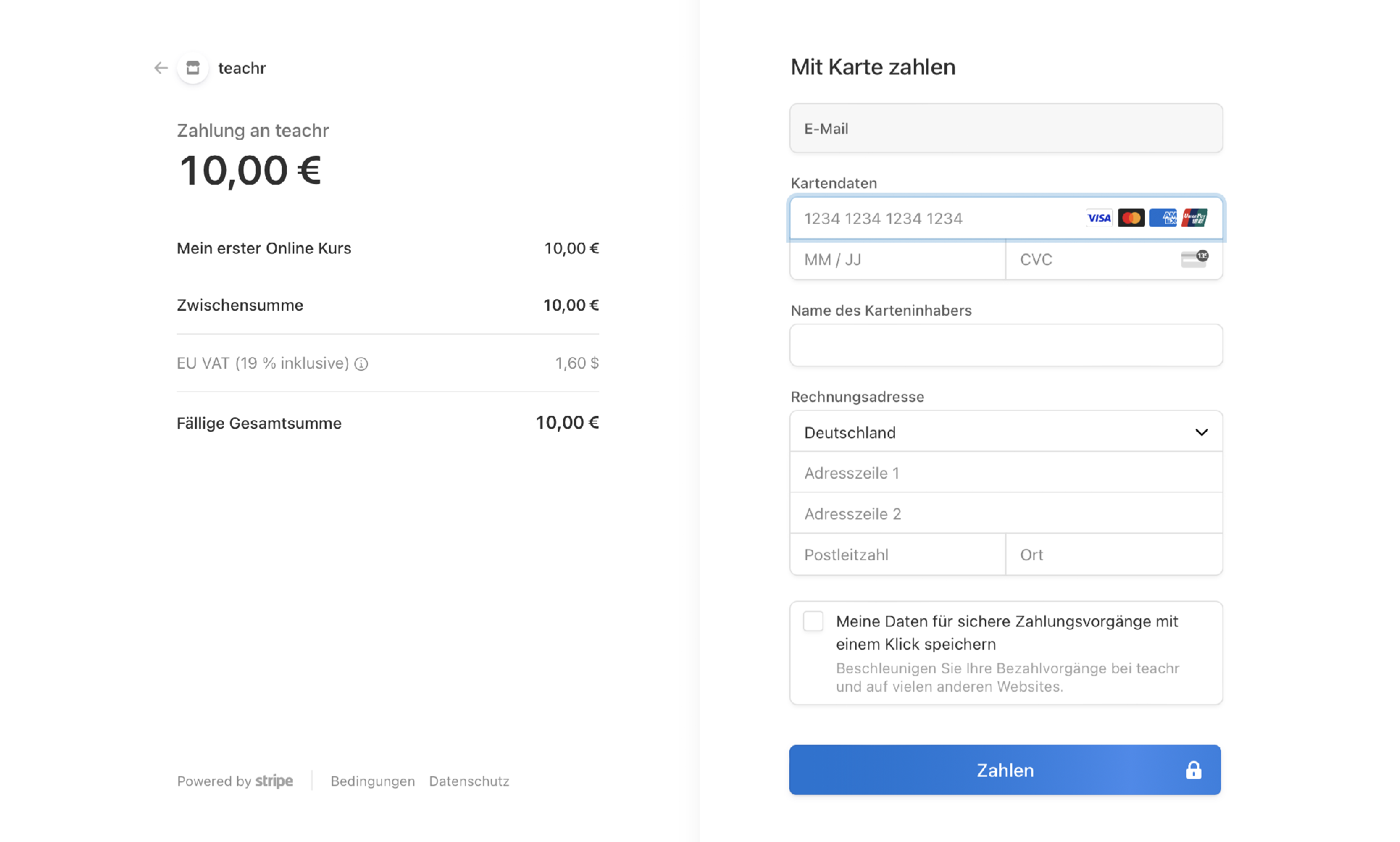 Sie erhalten das Geld von Stripe für den Verkauf Ihrer von teachr verwalteten Kurse.