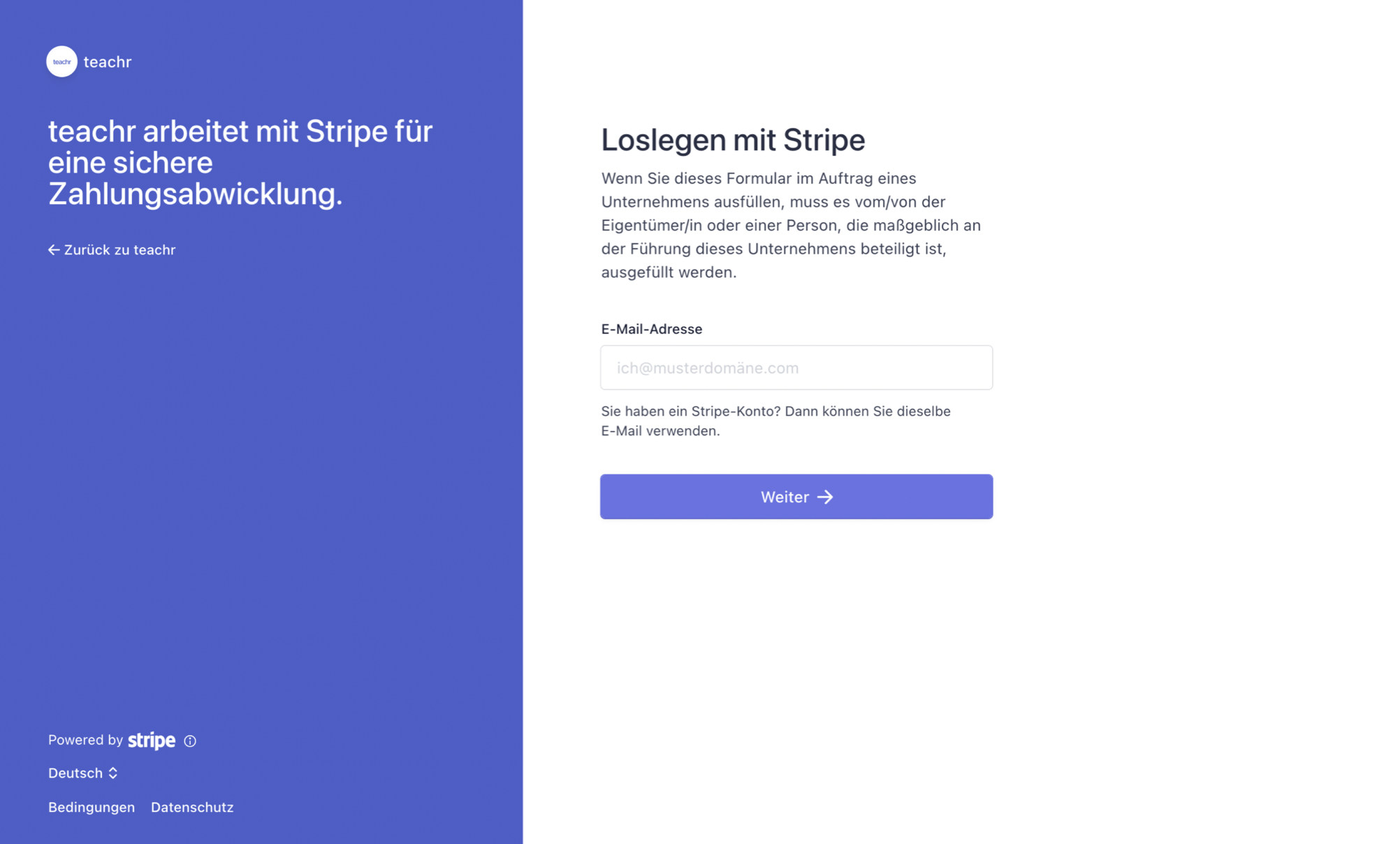 - Sie müssen nun Ihr Stripe-Konto verbinden, falls Sie dies noch nicht getan haben. Wählen Sie zunächst Ihr Land aus und bestätigen Sie, um Ihr Konto zu verbinden. Sie werden dann zu einem Stripe-Formular weitergeleitet. Folgen Sie den Anweisungen, um ein neues Stripe-Konto zu erstellen und es mit teachr zu verbinden.