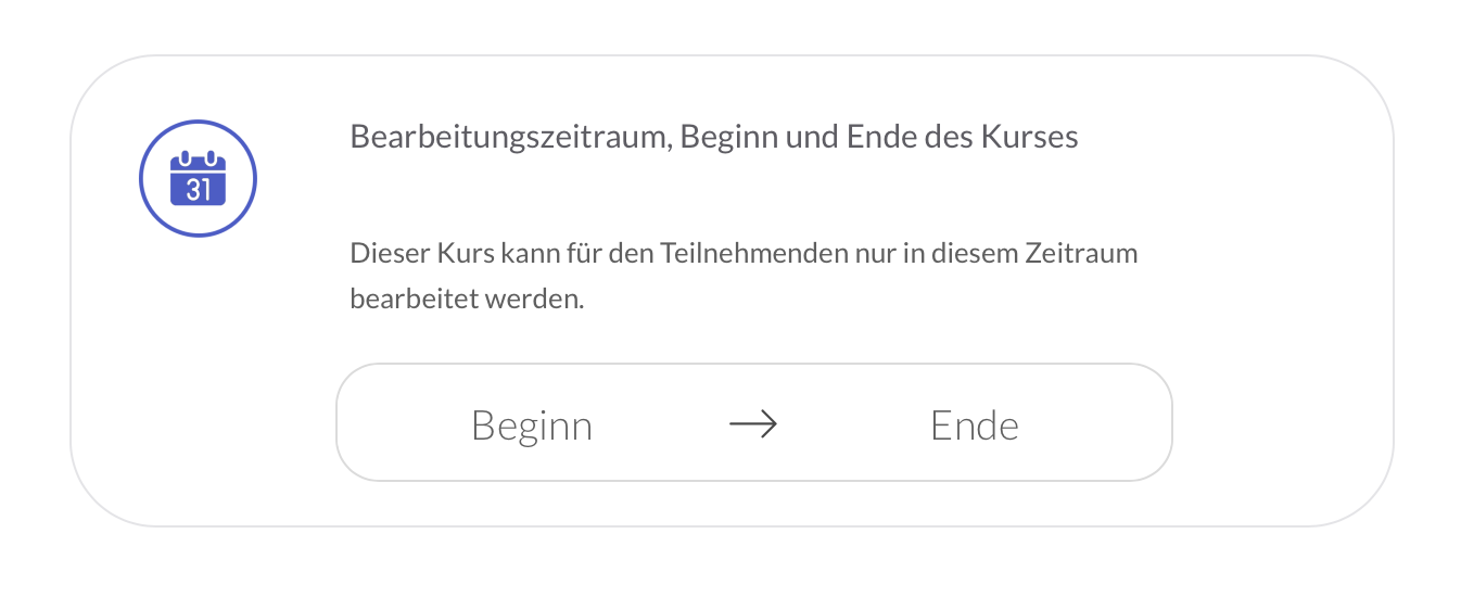 Sie können den Bearbeitungszeitraum des Kurses begrenzen und eine Frist setzen. Nach Ablauf der Frist kann der Kurs von den Teilnehmern nicht mehr fortgesetzt werden. Ein Tag endet bei dieser Einstellung um 0:00 Uhr GMT.