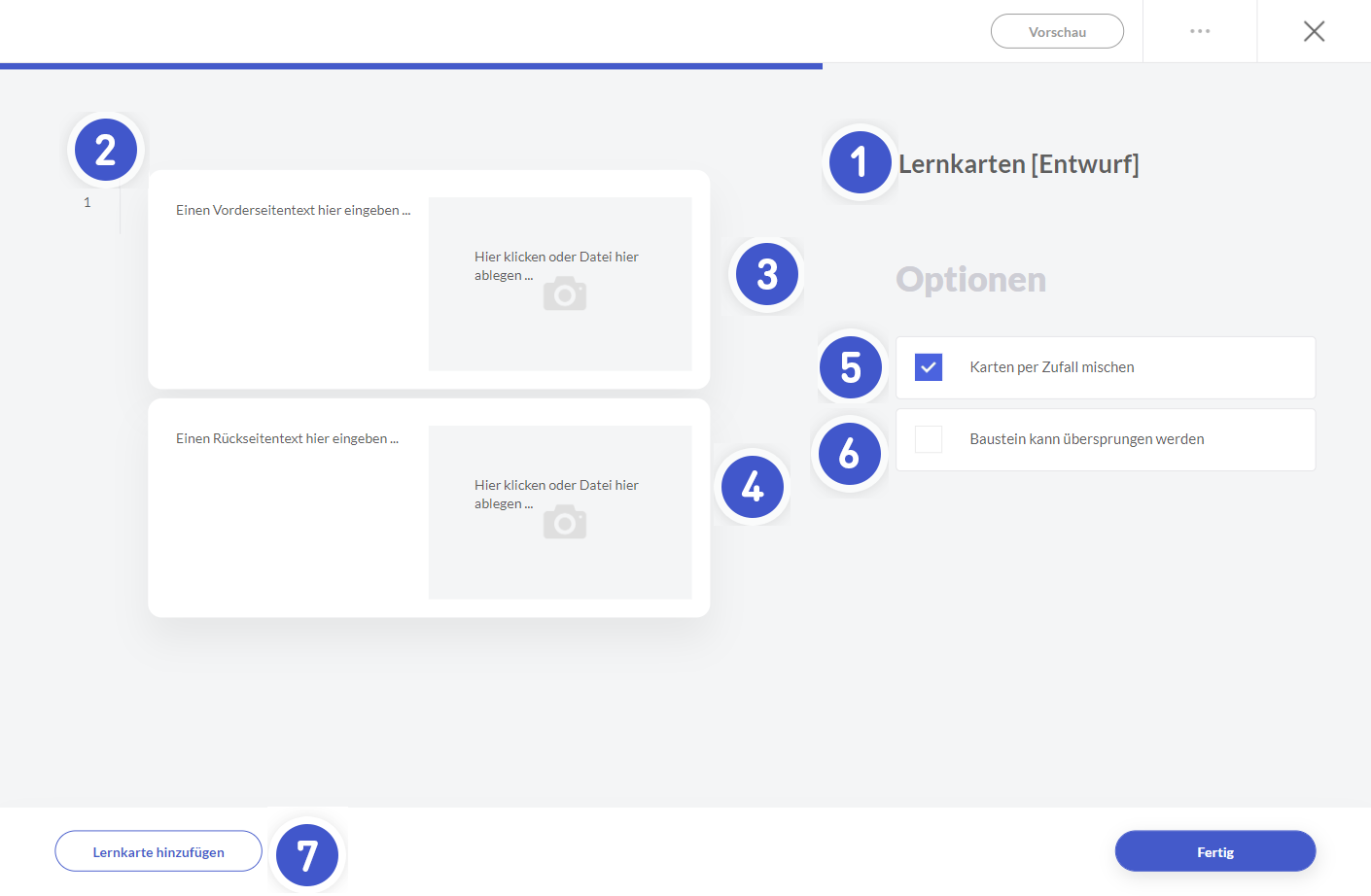 - Aktivieren Sie dieses Kästchen, um die Lernkarten zu mischen oder sie in der von Ihnen festgelegten Reihenfolge anzuzeigen.