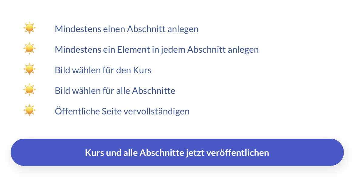 Um einen Kurs zu veröffentlichen, stellen Sie sicher, dass die Voraussetzungen erfüllt sind. Wenn dies der Fall ist, können Sie den Kurs entweder über die folgende Schaltfläche "Kurs veröffentlichen" veröffentlichen: