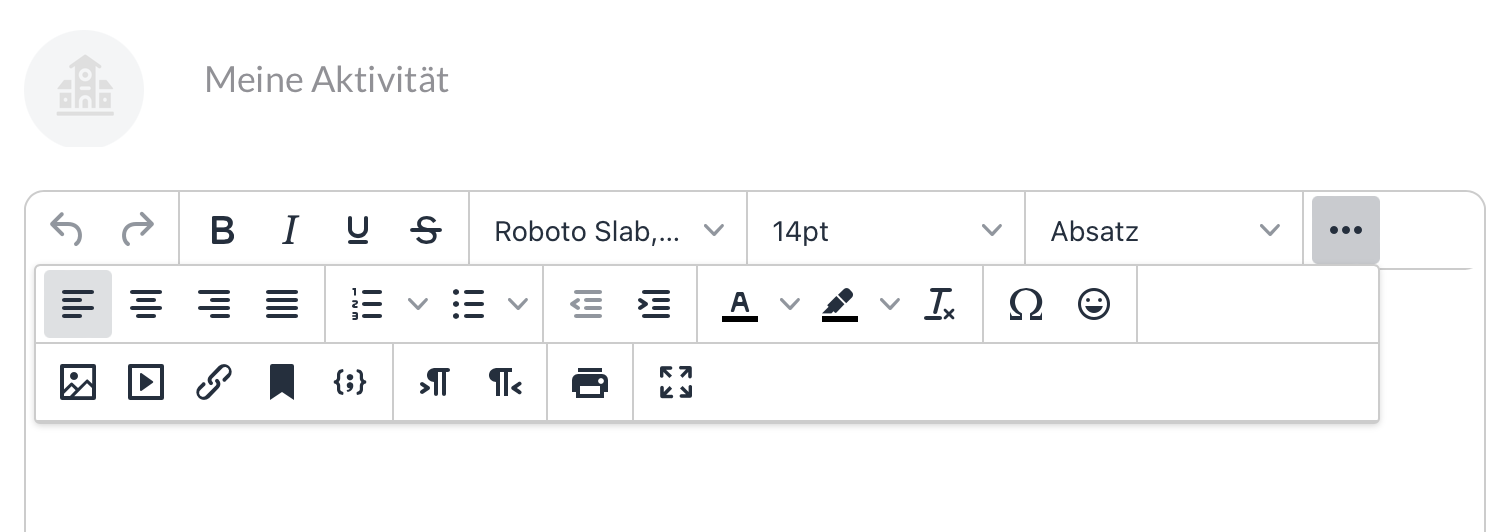 Um Multimedia hinzuzufügen, erweitern Sie die Medienleiste [...] und klicken Sie auf das Videosymbol, um ein Video einzufügen. Klicken Sie auf das Bildsymbol, um ein Bild einzufügen. Sie können hier auch einen Link zu Ihrem Kurs einfügen.