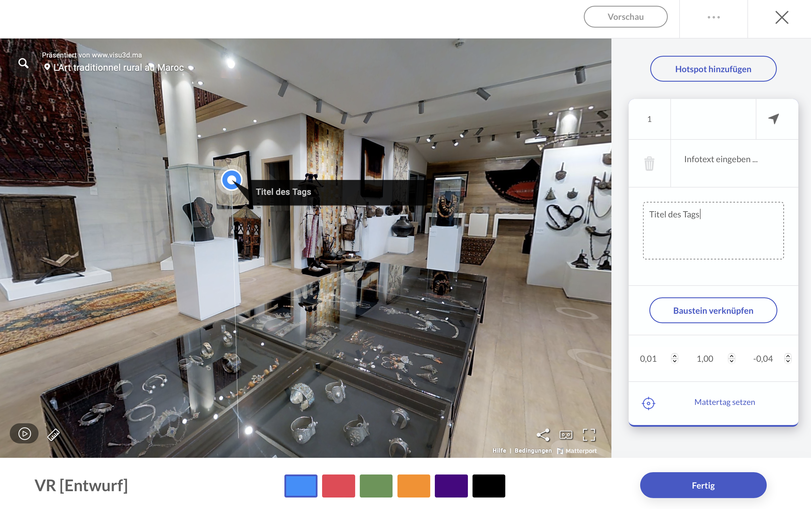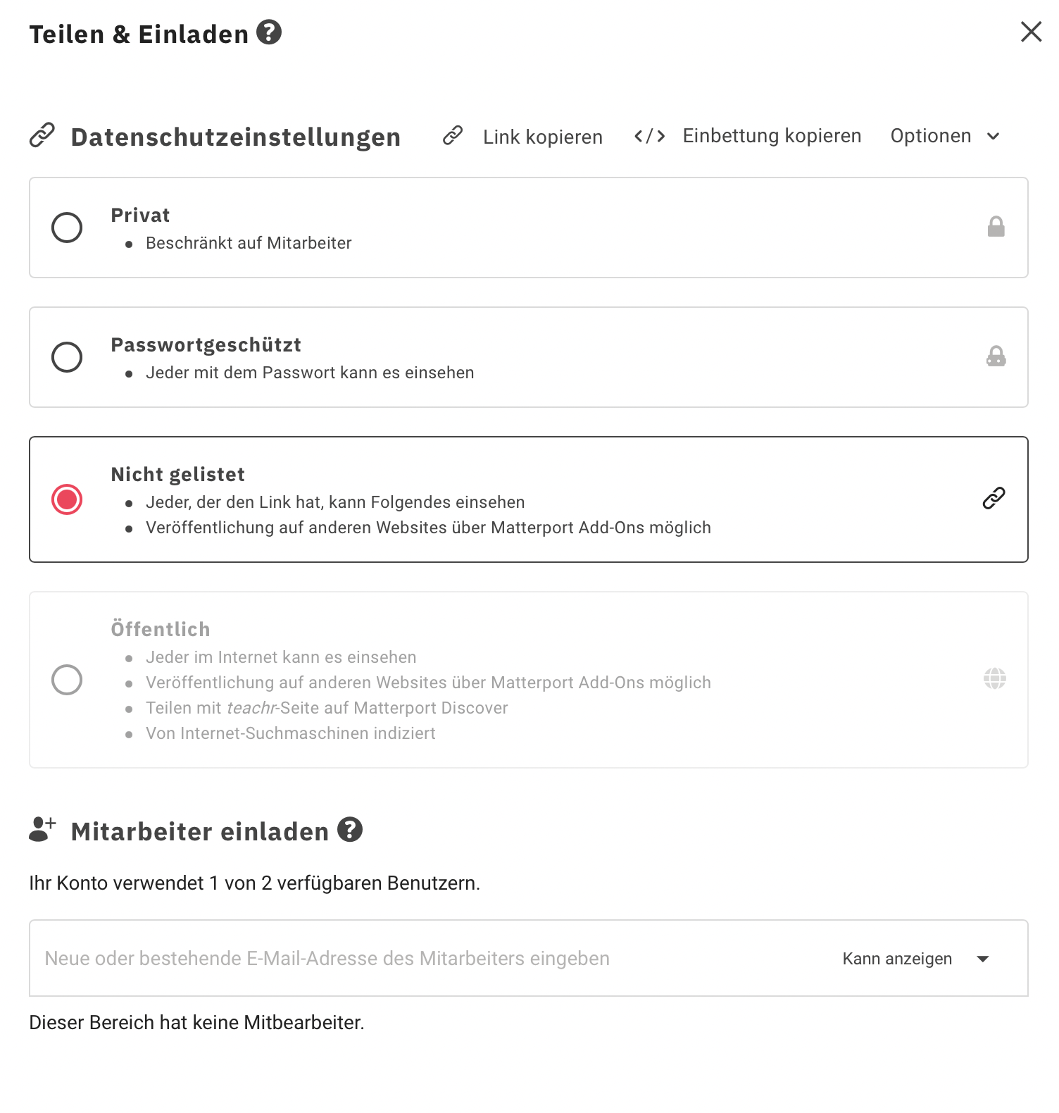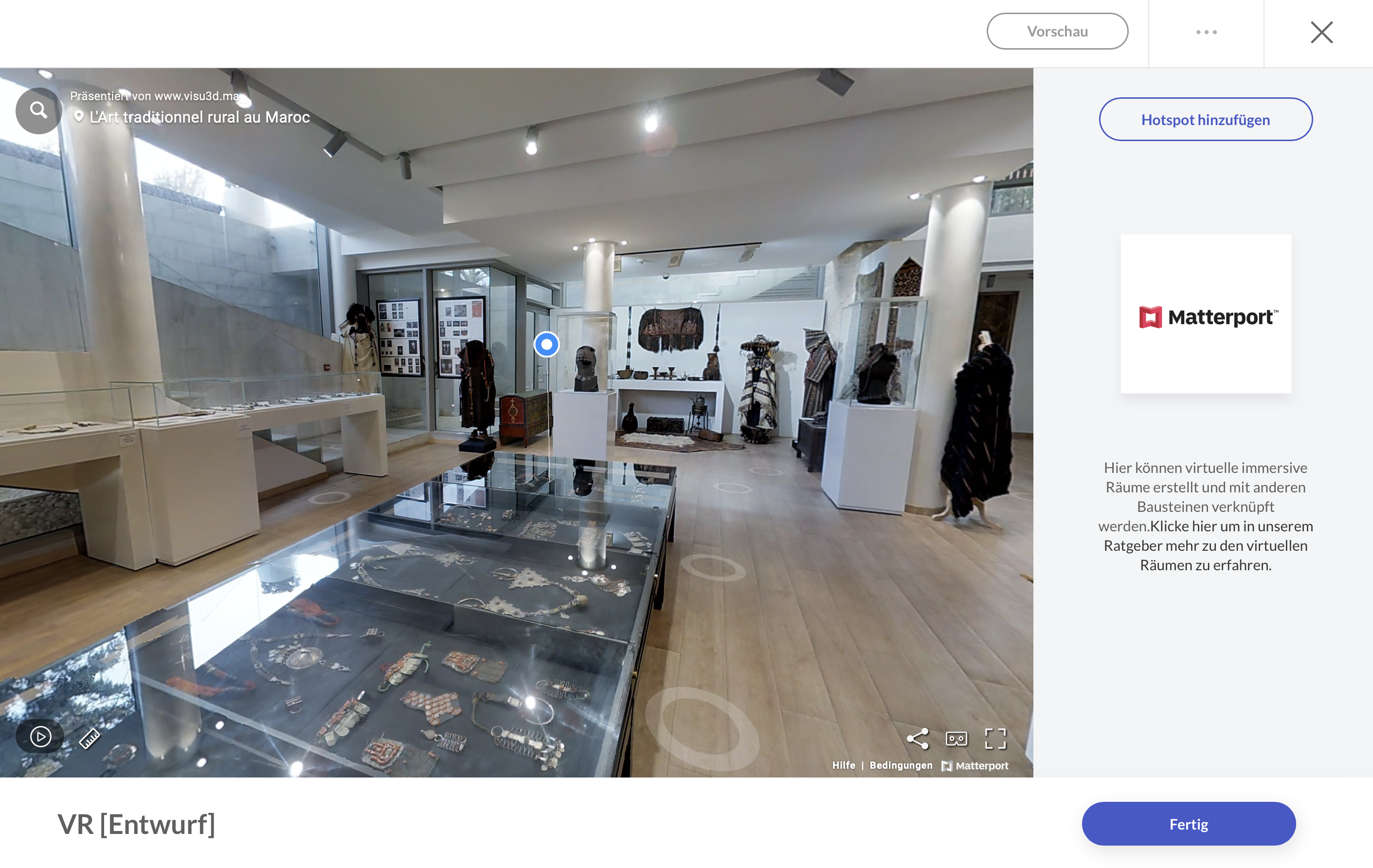 Der matterport-Szeneneditor erscheint, wenn eine URL öffentlich und gültig ist.