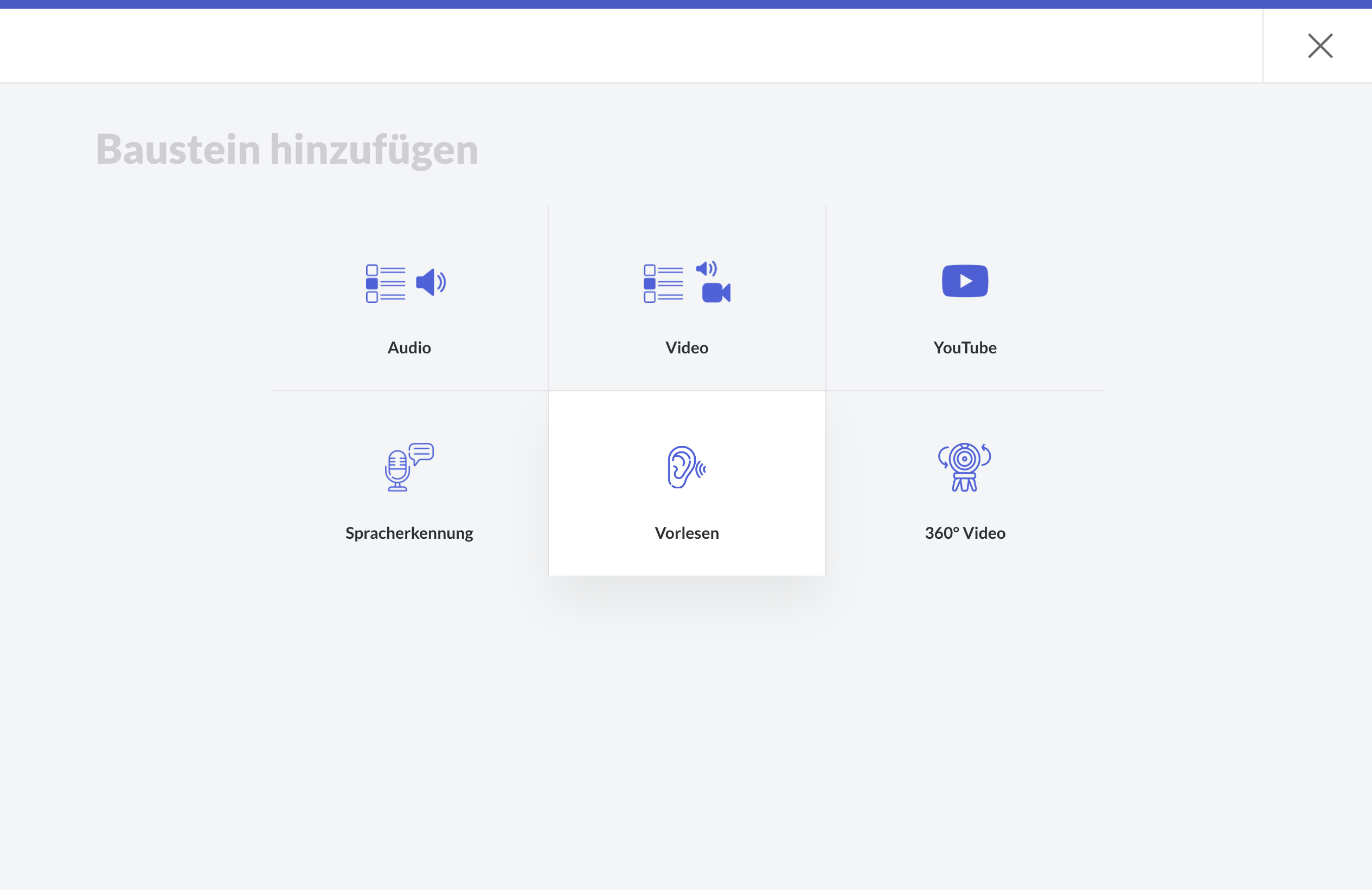 Gehen Sie zu Ihrem Kurs ➝ Ihre Sektion ➝ einen neuen Baustein hinzufügen ➝ (Alle Bausteine) ➝ Audio oder Video ➝ Vorlesen