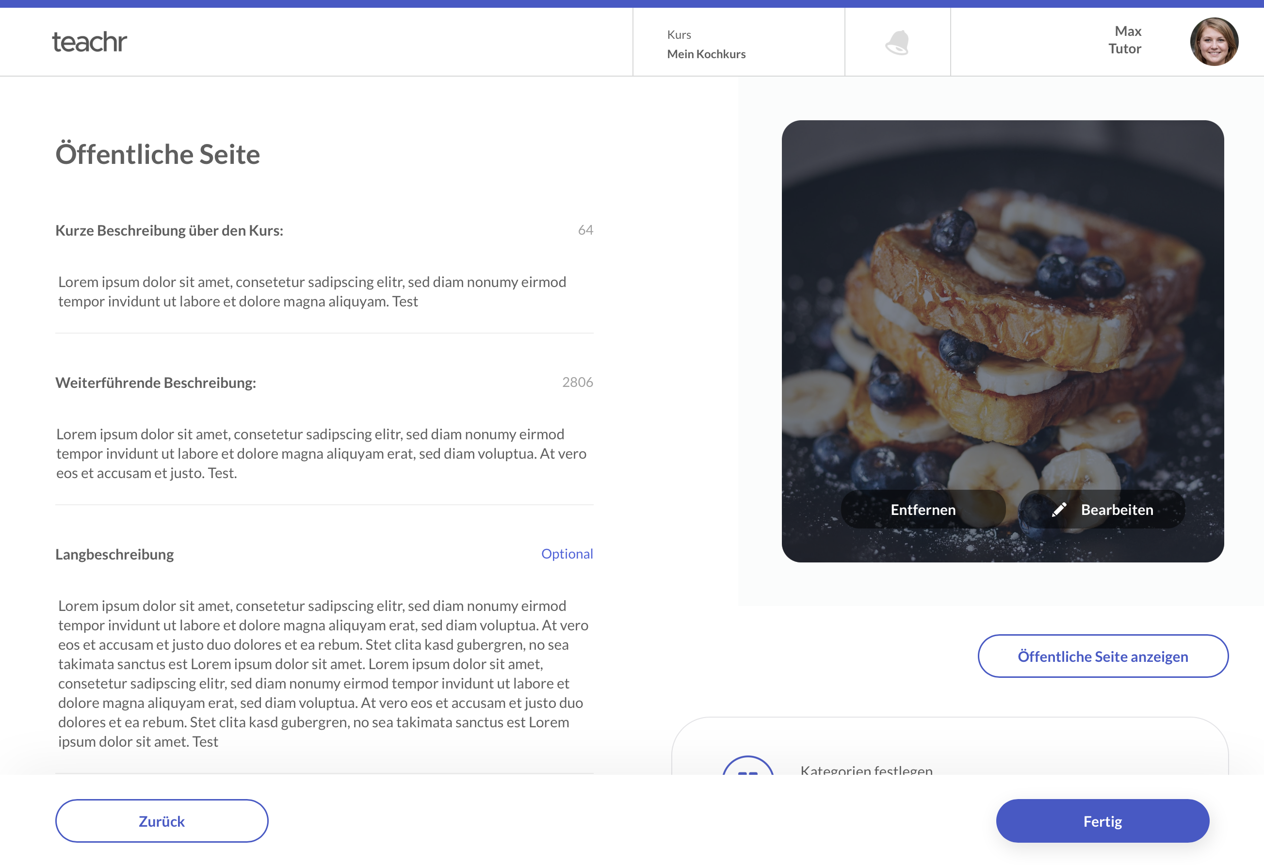 Wenn Sie die öffentliche Seite ausfüllen (Sie finden sie über die Schaltfläche "Öffentliche Seite bearbeiten" in Ihren Kurseinstellungen), können Sie: