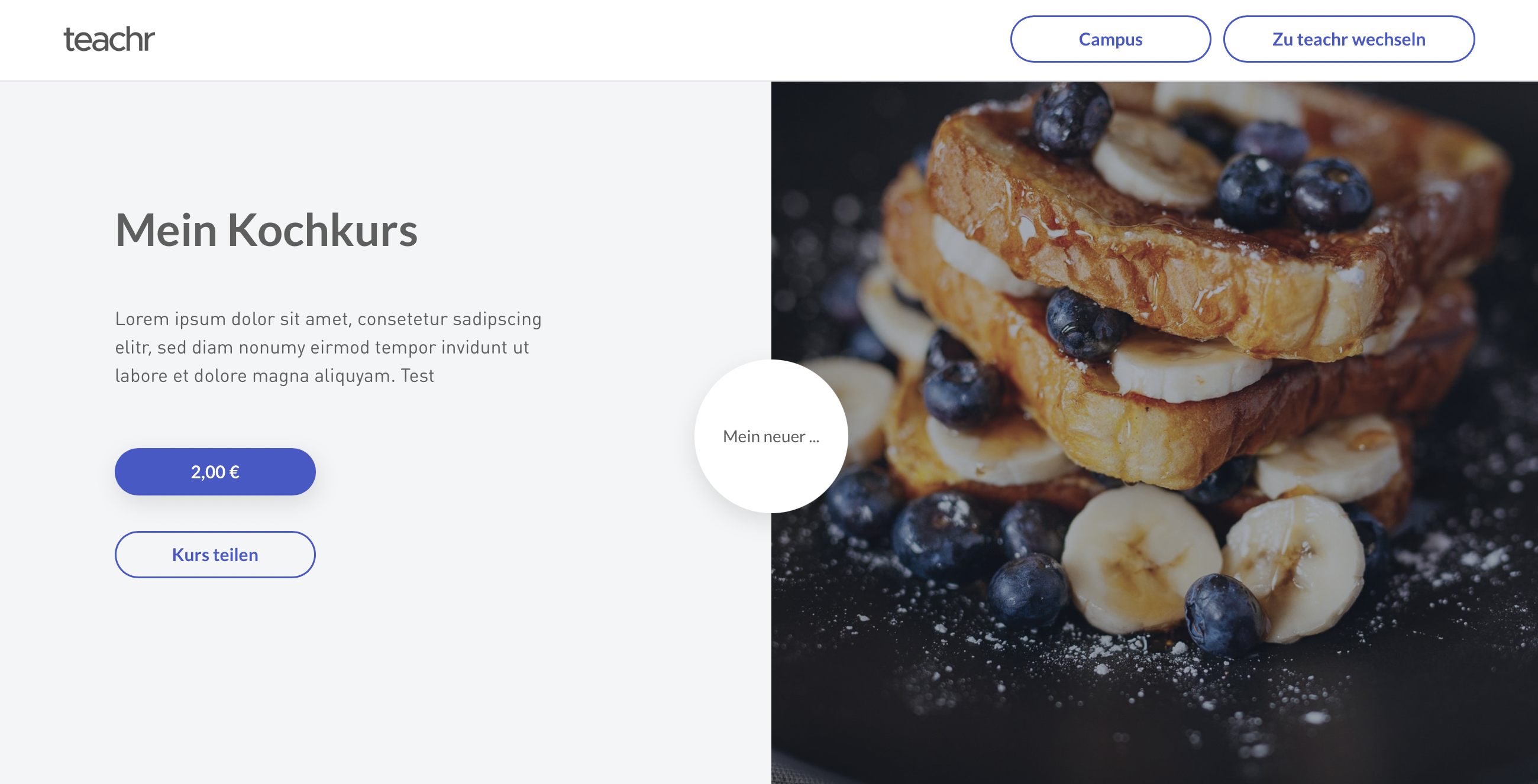 Sie können Ihren Kurs einem öffentlichen Publikum zeigen, wenn Sie ihn z. B. verkaufen möchten. teachr bietet Ihnen eine schön gestaltete Landing Page, um Ihren Kurs zu bewerben.
