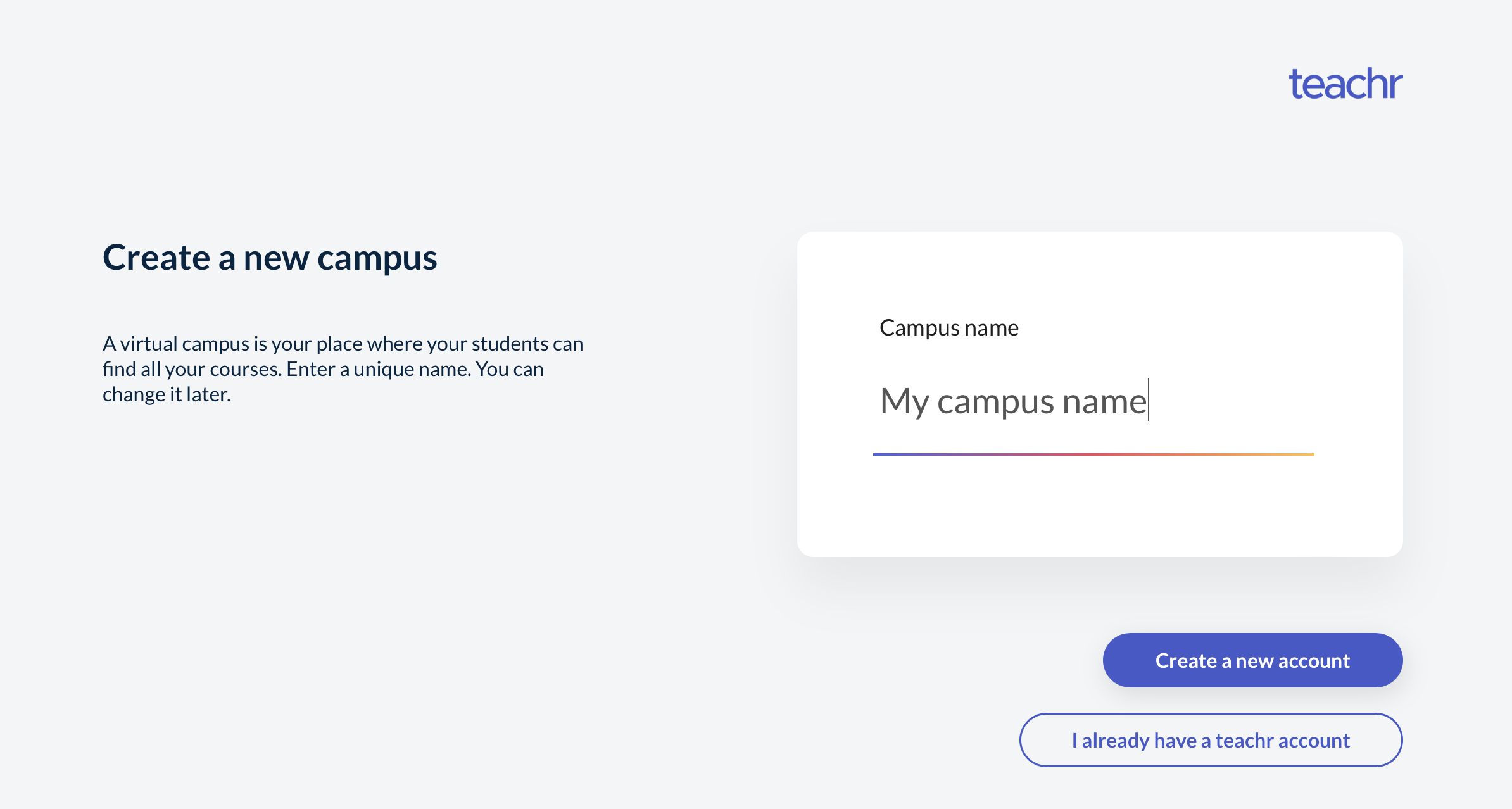 If you already have a teachr account then click on I already have a teachr account . This virtual campus will be created in your current account.