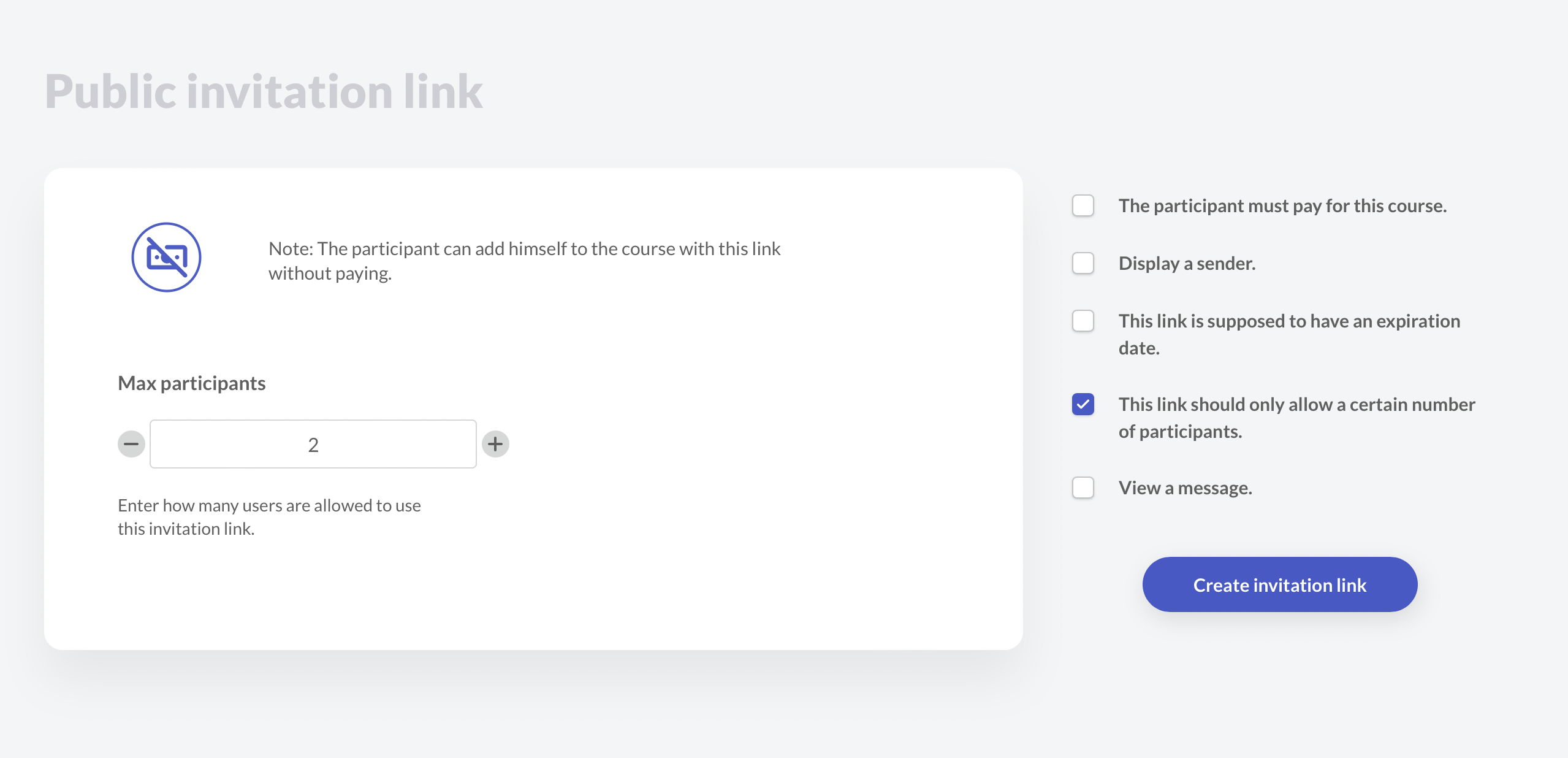 Click the Invite Participant button in the upper right corner to create an invitation link. Once a course payment and price are set, you can simply copy the link for your course's public page. It will be displayed after you click Create Invite Link.