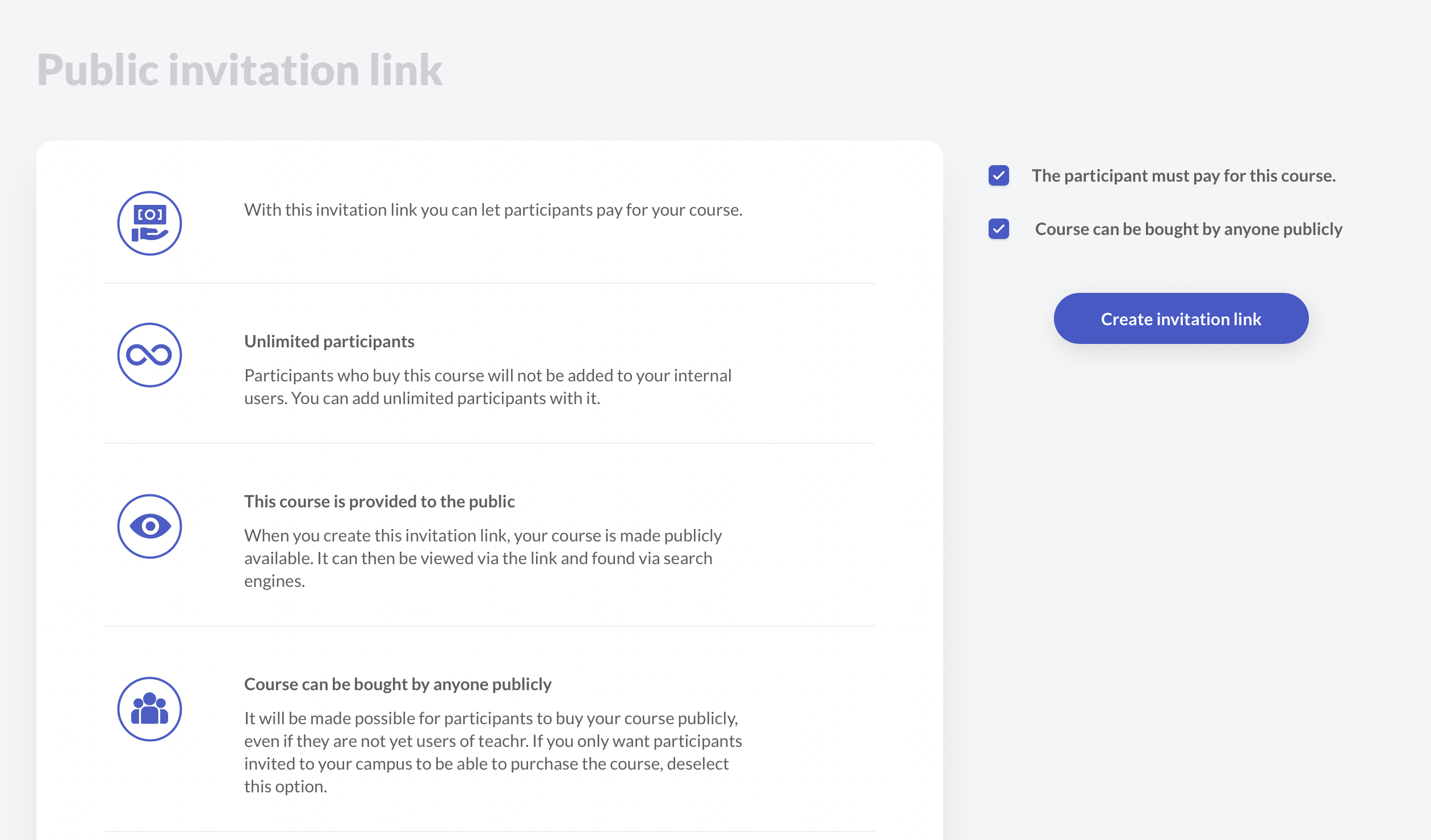 See also how to create invitation links and invite participants or learners to your course.