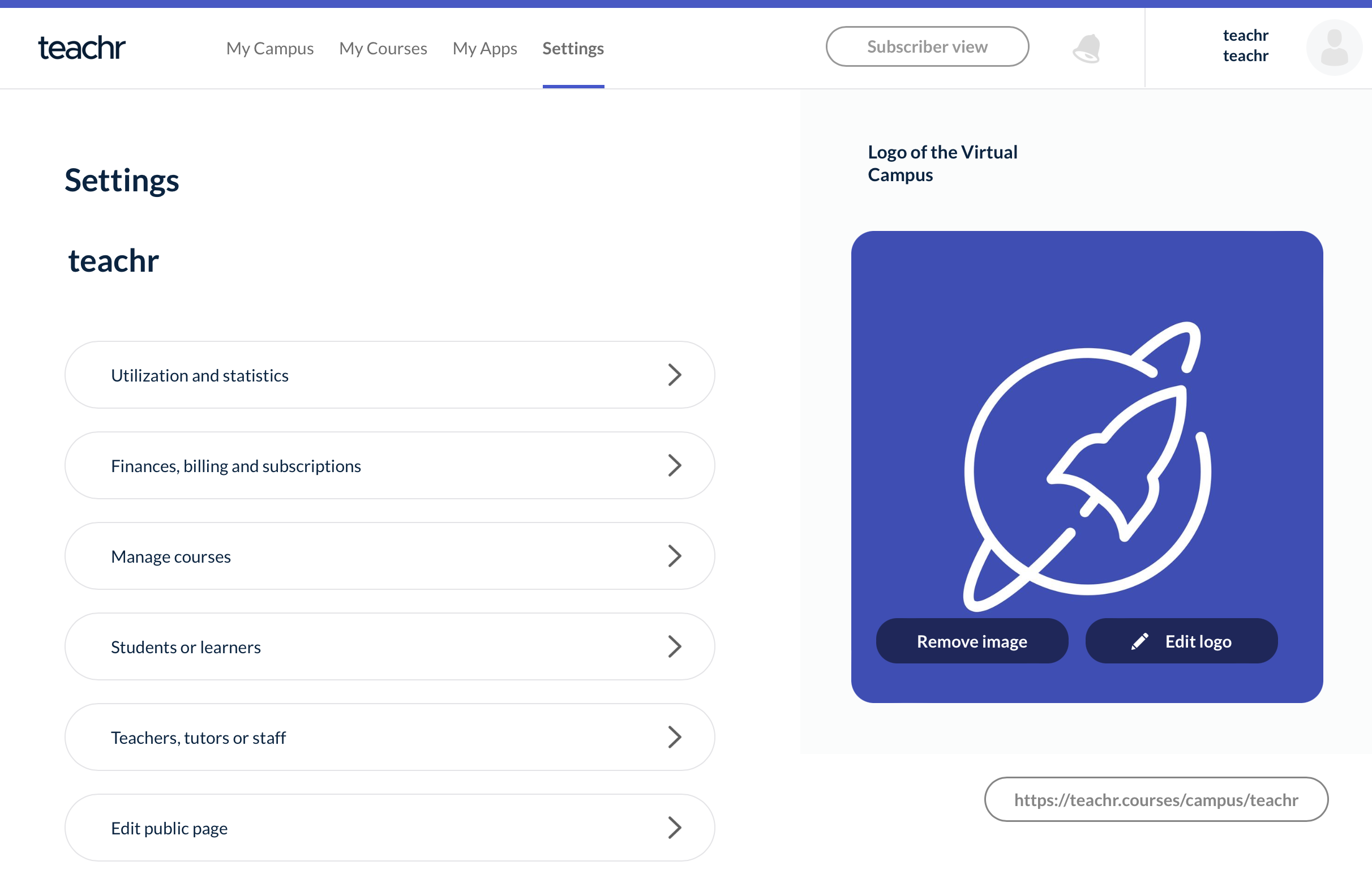 In this settings dashboard you will find some settings about your campus. For example, you can customize the public page of your campus or set up your privacy policy. You can also find here the page for managing students, staff, teachers and users.