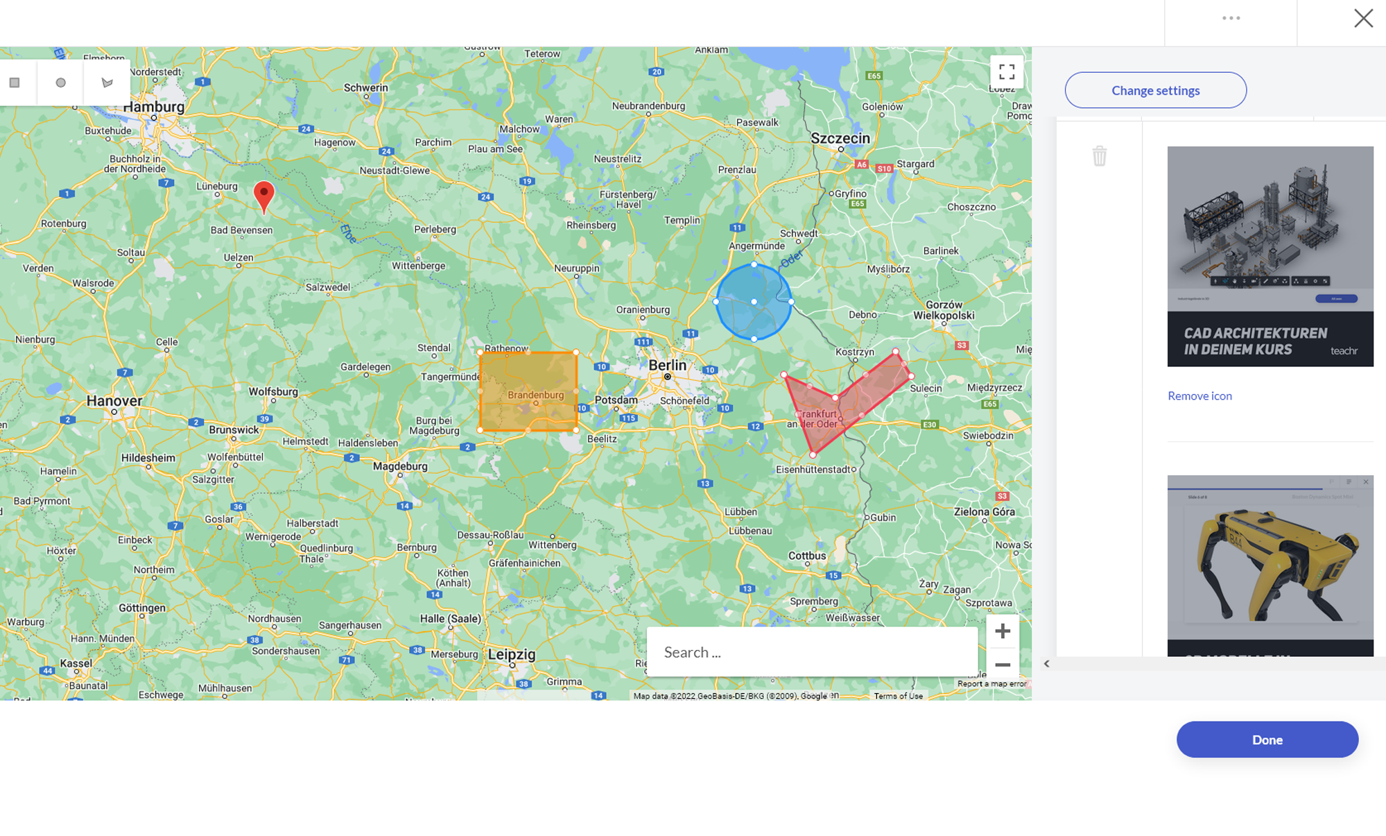 You can create circles, polygons, rectangles or polylines to draw some lines on the map. You can also mark some points of interest or places where you can upload an icon as a marker and an image.