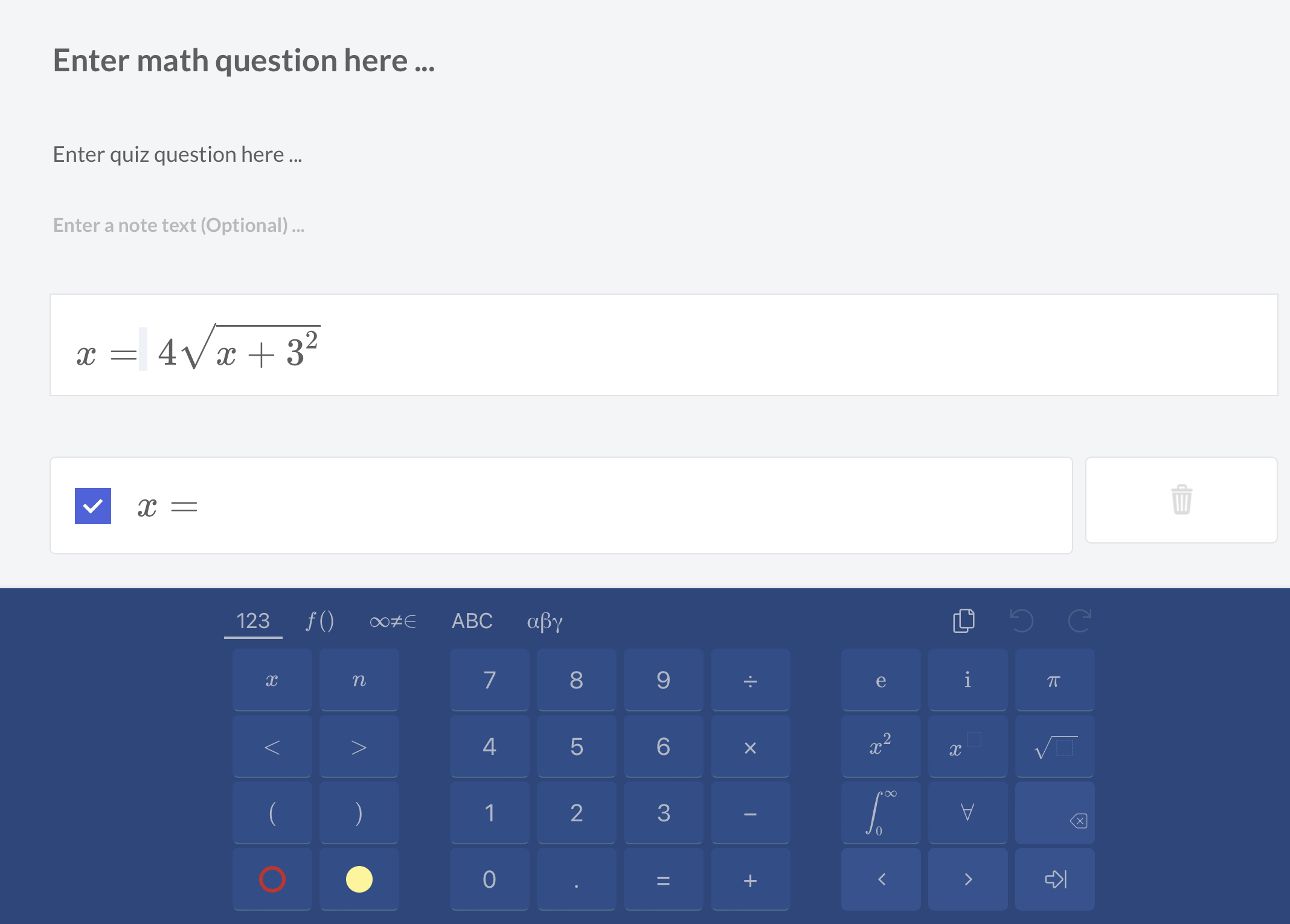 A math quiz is no different from a regular quiz, except for a really cool math editor for entering formulas!