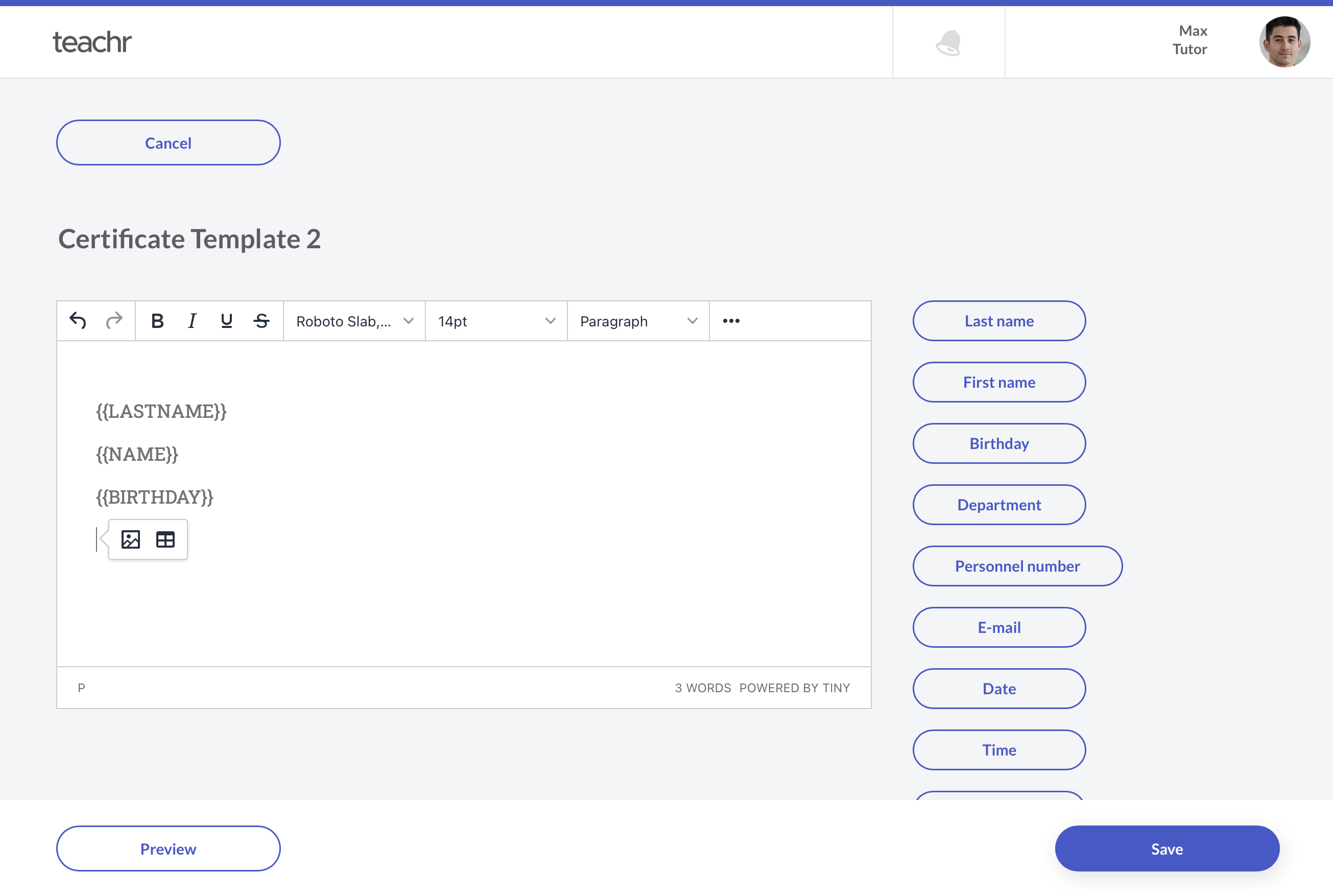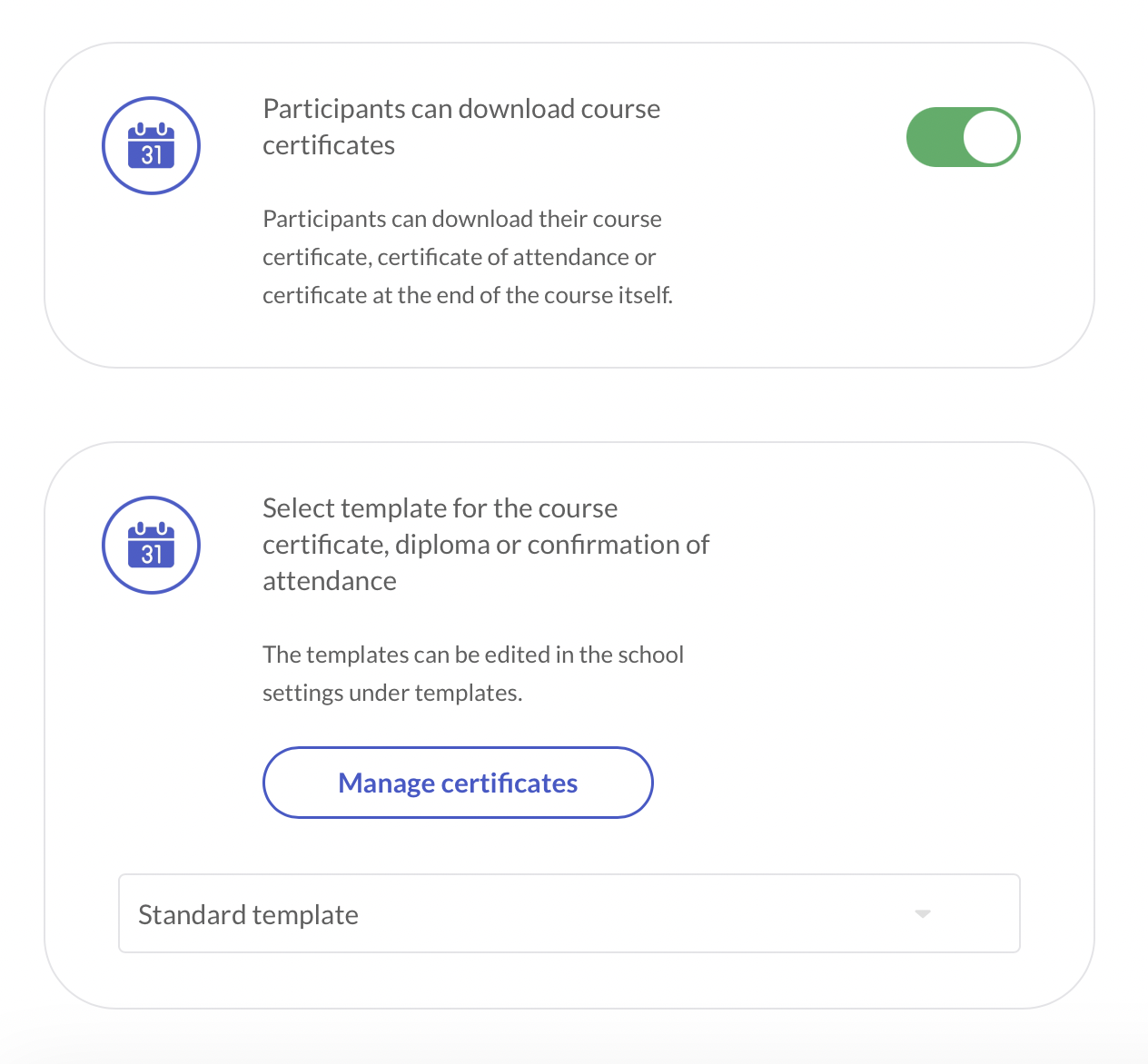 You can select a standard template for the course certificate, diploma or confirmation of attendance or you can create a template.